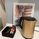 This apartment includes a walk-in shower, a separate toilet, and a washing machine for your comfort. A hair dryer and towels can also be found.